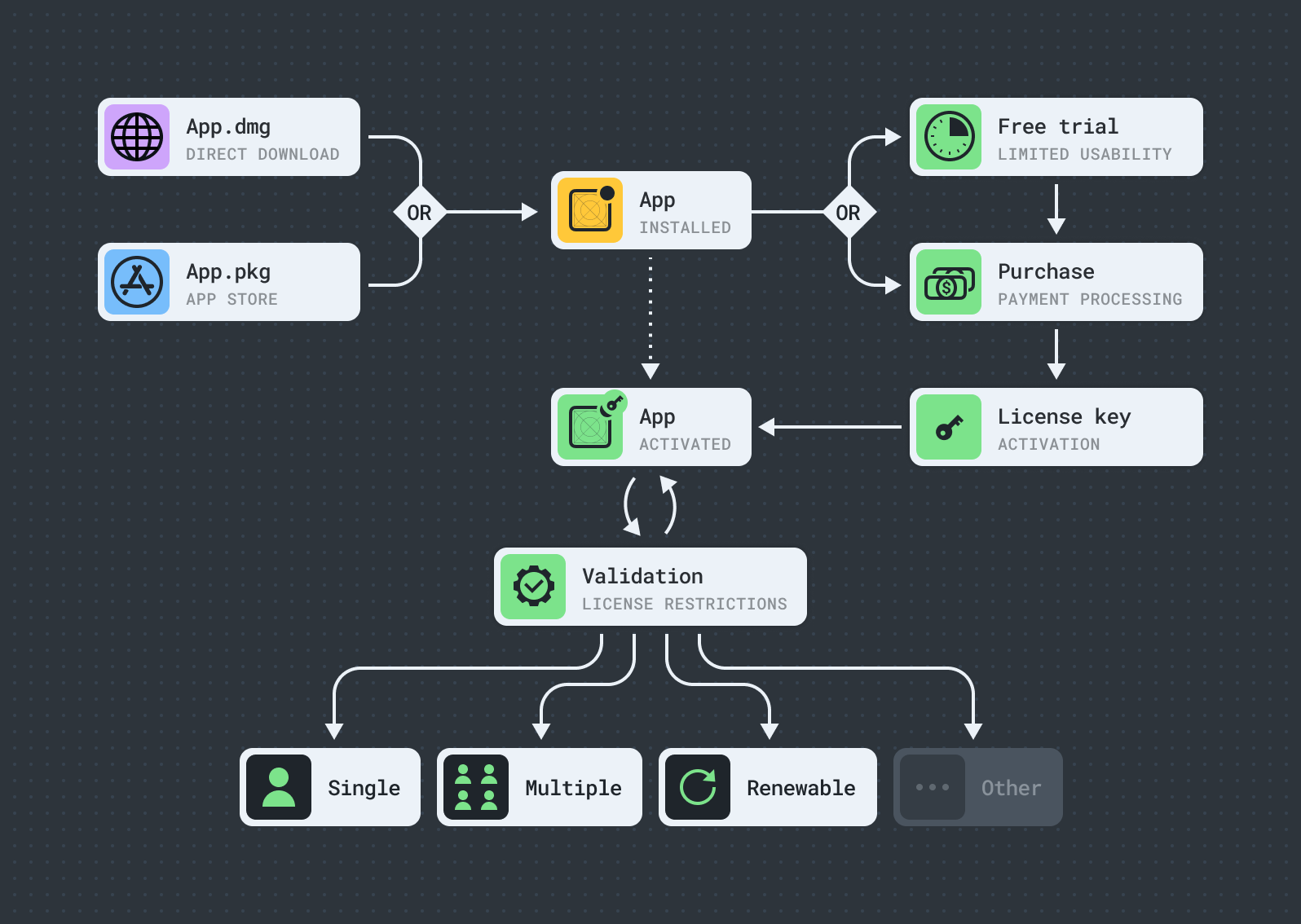 License purchase: This transaction defines the agreement between the user and the seller, which usually requires a payment in exchange for a license. Depending on the distribution method, this can be a manual procedure on a developer's website, or it can be fully automated and done behind the scenes in an app store. Apps that are directly distributed usually utilize payment processing and license management platforms. Once the transaction is complete, a unique license key is generated and delivered to the user.